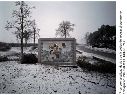 Fotógrafo chino contemporáneo, He Chong Yue lleva haciendo fotografías desde hace más de 20 años, siempre desde una perspectiva social. Sus obras nos trasladan a la China de la Revolución Cultural de la época de Mao, mostrándonos los mensajes directos sobre la planificación familiar. Fotografías centradas en murales de cerámica y vallas publicitarias, tomadas en los márgenes de autopistas, carreteras comarcales y entradas de los pueblos. El gobierno chino sólo admite un hijo único por familia, ya sea niño o niña. En el caso de querer tener más, hay que pagar unos impuestos muy elevados. Este control de natalidad conduce a la selección de hijos varones, sobre todo en las zonas rurales, que serán los que ayuden en las tareas agrícolas y asistan en caso de enfermedad, incapacidad de trabajo, vejez, etc. He Chong Yue en “Mil millones contra uno: Ser padres según la mentalidad feudal” aparece reflejado con su cámara en todas las fotografías en un espejo redondo, como reflejo de su propio pasado. Las fotografías seleccionadas, están realizadas en el invierno de 2007/2008. Envueltas en un halo de misterio, con detalles y colores apenas perceptibles.Imágenes que inspiran a primer golpe de vista calma, pero que poco a poco sumergen en los problemas sociales del país.